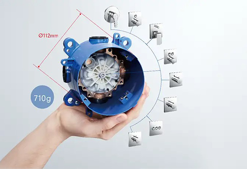 Tính linh hoạt cao khi lắp đặt phụ kiện âm tường MINI UNIT là một trong những điểm thu hút nhất. Những bộ phận này không chỉ đạt chuẩn nhỏ gọn nhất mà còn nhẹ nhất dành cho các loại sen tắm âm tường. Bộ thân van nhẹ giúp giảm tải trọng cho bề mặt tường, đồng thời linh hoạt hơn trong việc lắp đặt. Để lắp đặt thân van này, tường phòng tắm nhà bạn chỉ cần dày khoảng 97mm với sai số trong lắp đặt vào khoảng ±13mm.
